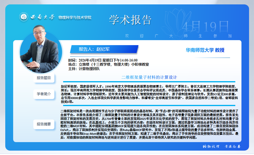 【学术报告】二维框架量子材料的计算设计
